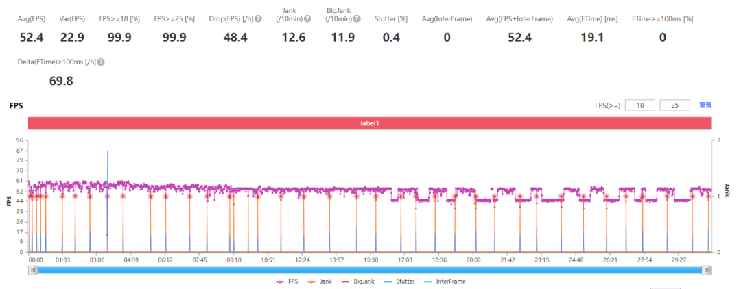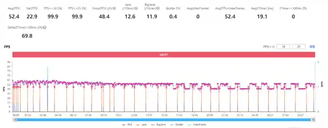 保持 Wi-Fi 连接,手机打开性能模式,室温 24℃,手动 300nit 亮度,开启极高画质、开启 60 帧、关闭动态模糊,夜间璃月港跑图 30 分钟,测试结果如下,平均帧率为 52.4 帧,前 16 分钟在 55 帧附近徘徊,17 分钟时帧率开始波动,最低帧约为 45 帧。
