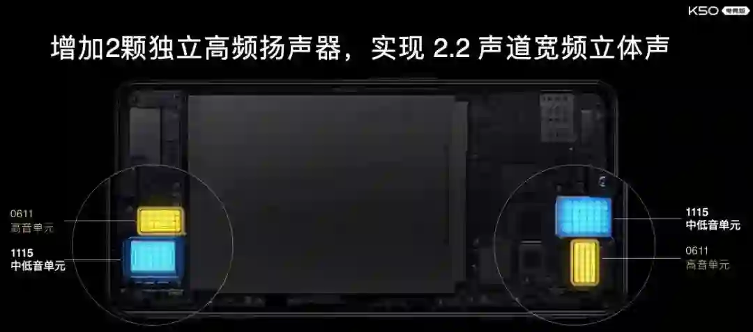 除此之外,Redmi K50 电竞版还升级为了 JBL 宽频四单元扬声器,分别由 2 颗 1115 中低音单元和 2 颗 0611 高音单元组成,对称的双水滴形开孔看上去比较个性,至于实际的音质提升究竟如何,大家可以实际感受一下。