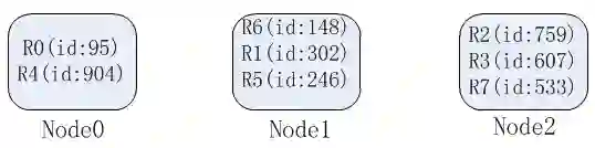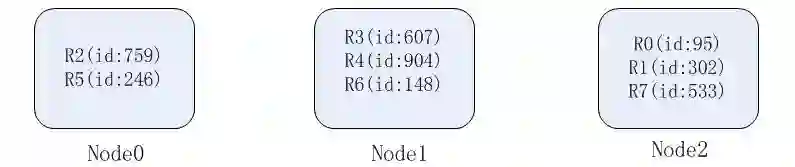 为了后面分析不同的数据分片方式,假设有三个物理节点,编号为N0、N1、N2,有以下几条记录: