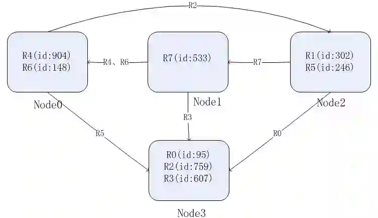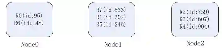 我们选择id作为数据分片的key,那么各个节点负责的数据如下:
