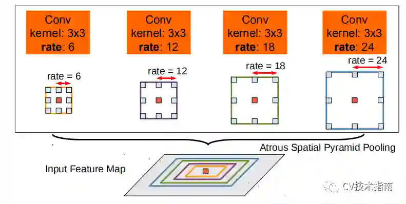 ASPP是基于第二种方式来构建的,具体如下图所示:通过多支路后进行concate,再进行1x1卷积。这篇论文比较简单,主要贡献就是提出了这种构建方式。