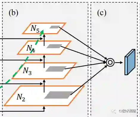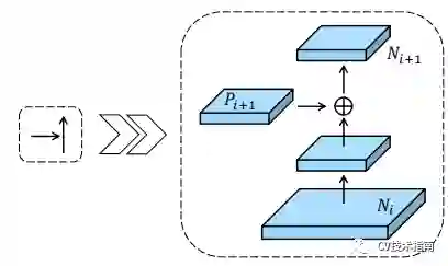 具体路径的实现方式如下图所示,对lower level先进行步长为2,大小为3x3的卷积进行降采样,再与邻侧同大小的level逐像 素相加,再进行3x3卷积,形成Ni+1。