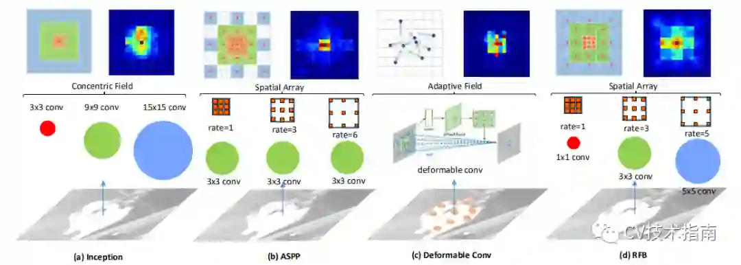 RFB论文认为ASPP使用不同空洞率的空洞卷积所组成的多分支结构效果很好,但由于在使用之前,使用的是同尺寸的卷积核,导致每条分支产生的分辨率仍然是相同的,只是感受野不同而已。这样的方式与雏菊型卷积核相比,产生的特征并不是那么明显。