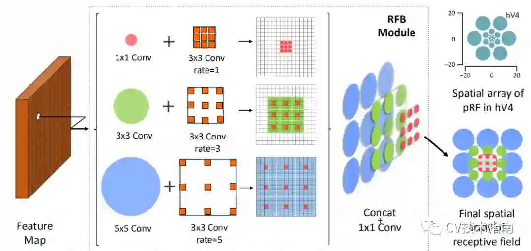 因此,RFB论文提出了Receptive Field Block,主要做法就是在进行空洞卷积前加一层不同大小的卷积层,分别是1x1, 3x3, 5x5这样每条支路产生的分辨率不同。