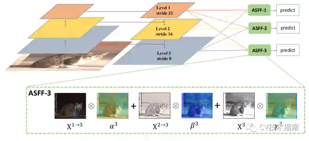 基于这个问题,ASFF提出了adaptively spatial feature fusion (ASFF)。主要思想是将每层的信息都相互融合起来。