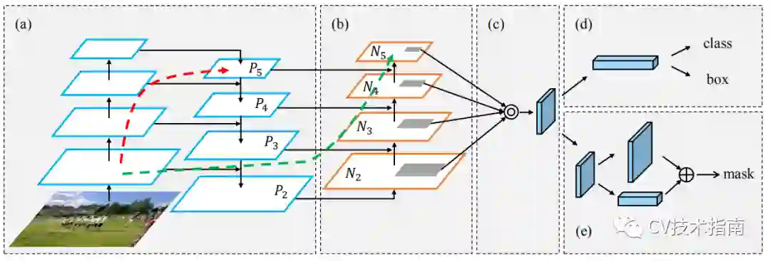 在PANet同样基于这一点,提出了在FPN中自上而下的路径的基础上增加了一条自下而上的路径,具体如下图所示。