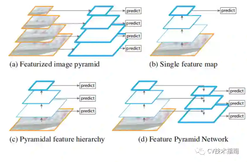 对于一般的神经网络都是采用图b所示的方式来预测,通过对图像多次降采样,在最后一层进行预测,这种方式的缺点是对小目标的检测效果不好。