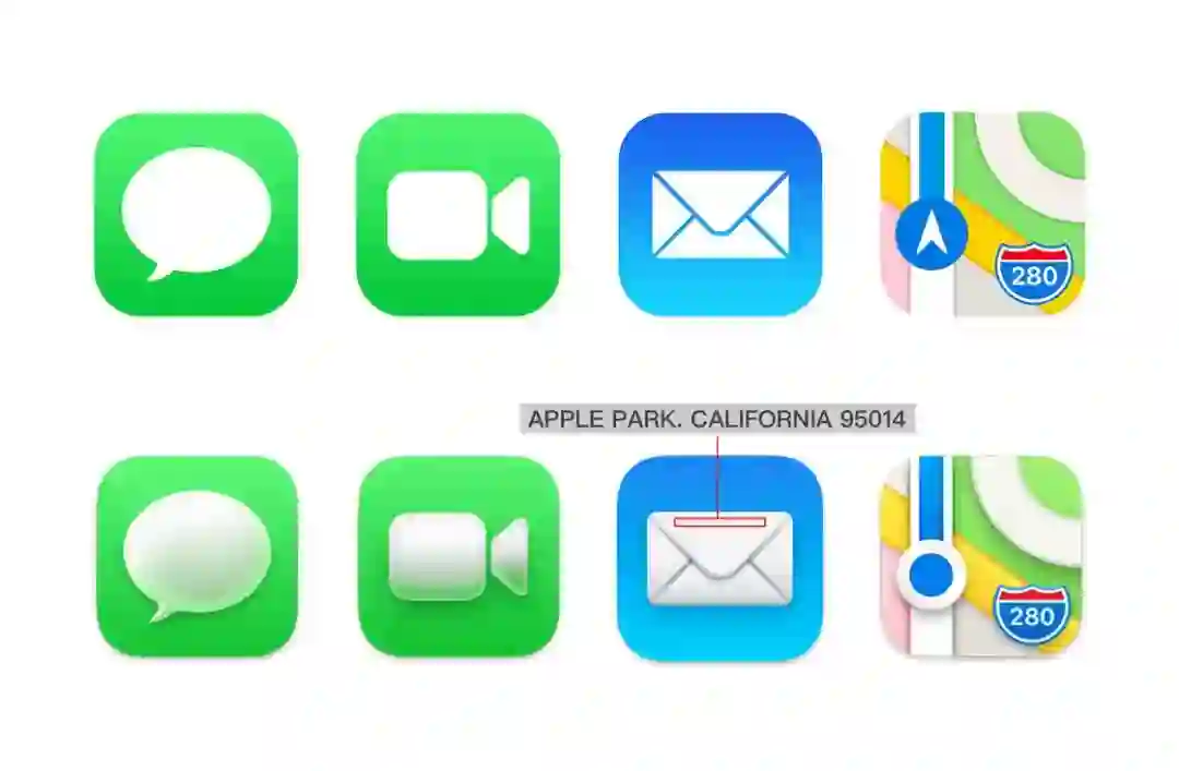 说是类似,因为 Big Sur 和 iOS 目前的图标风格确实有一些不一样。几乎一致的圆角矩形,但 iOS 14 的图标风格是完全的扁平化,而 Big Sur 的图标则保留了细节阴影部分,显得更有层次感,甚至部分图标还特地加上了一些不易察觉的细节,如邮件图标上的文字「APPLE PARK CALIFORNIA 95014」,也就是 Apple Park 的地址。