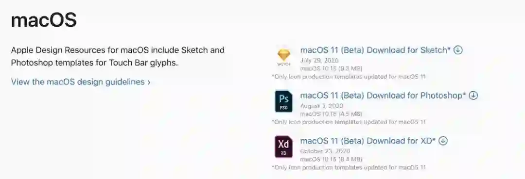 一旦新版本发布,苹果官方一般都会及时给出新的设计素材,有 Sketch、PS 以及 XD 不同版本;其次,本文所提到的图标库网站上也提供了制作 Big Sur 风格图标的设计素材,支持 Sketch、Figma、Illustrator、Photoshop 四个不同类型文件。