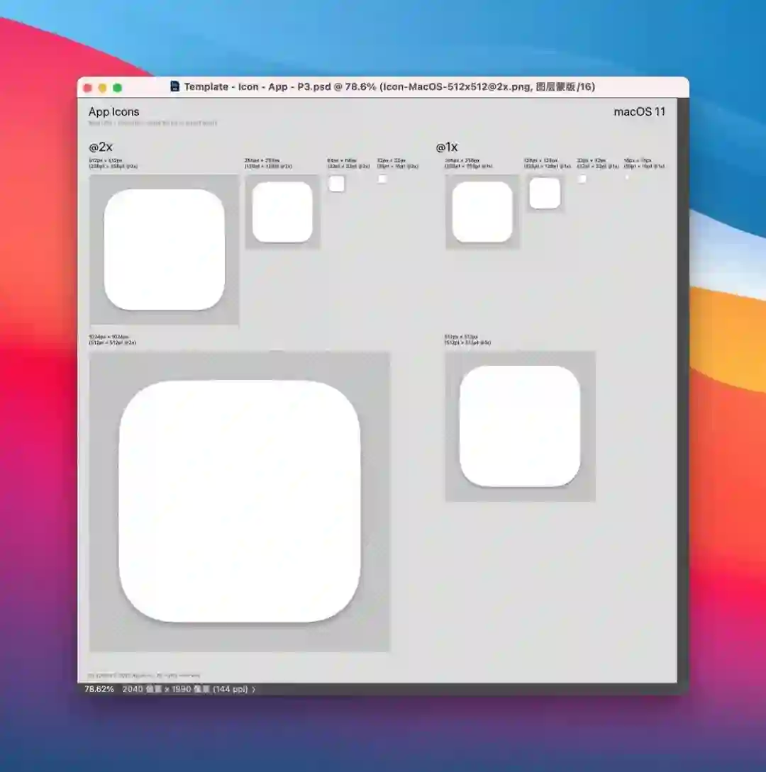 在 Photoshop 中制作完成到处 PNG,可以利用 Image2Icon(免费版足够用)来将 PNG 转换成 icns 格式,即可直接替换掉应用默认图标了,格式转换过程使用其它软件应该也是没有问题的。