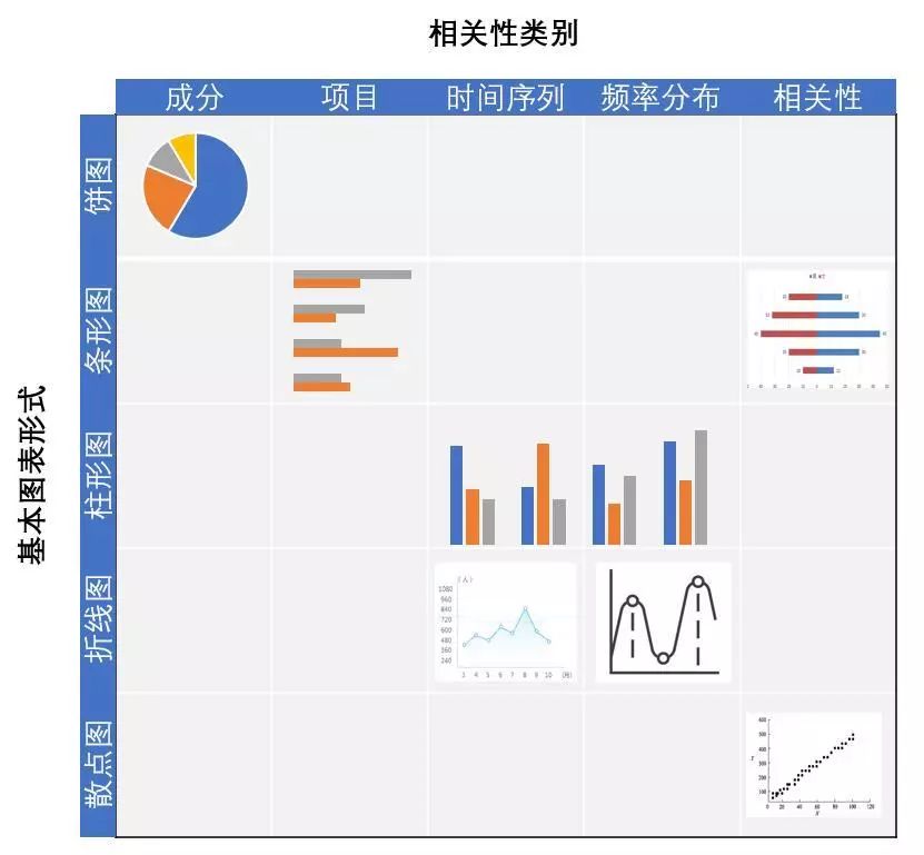 每一种相对关系都可以引导出相对应的图表形式,常见的图表形式包含:饼图、条形图、柱形图、折线图、散点图,当然不是特别完整哈,我们只是列举。