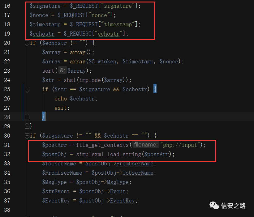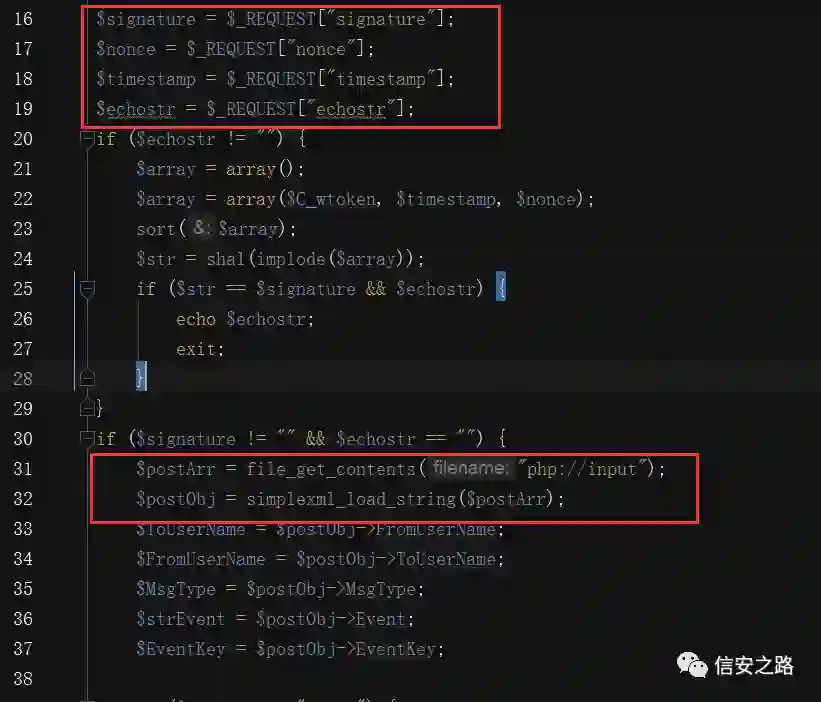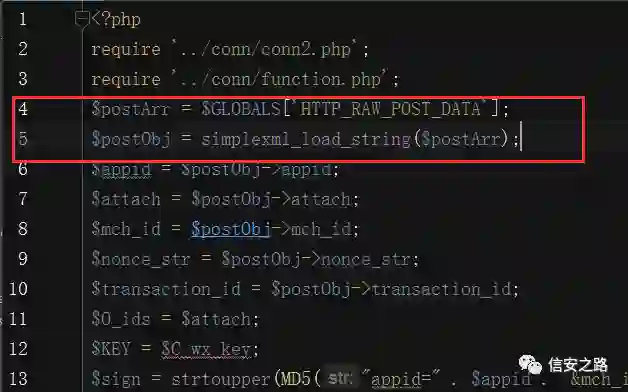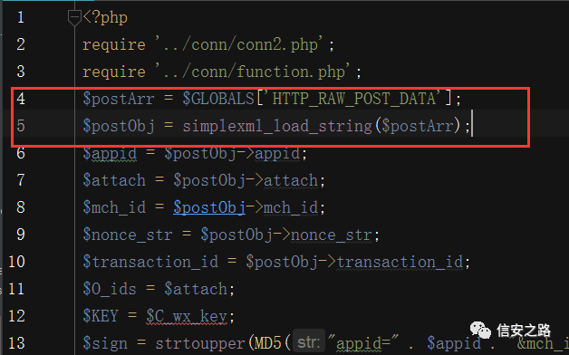 全局搜索关键字 simplexml_load_string 就可以找到漏洞点。不难观察出 $postArr 值使用伪协议写入,是我们可控的,因此只要传入构造好的 XML 语句即可外带出数据。而这个漏洞点是不会回显获取到的信息,因此只能构造 OOB 进行数据外带。