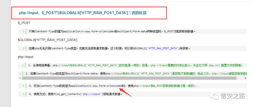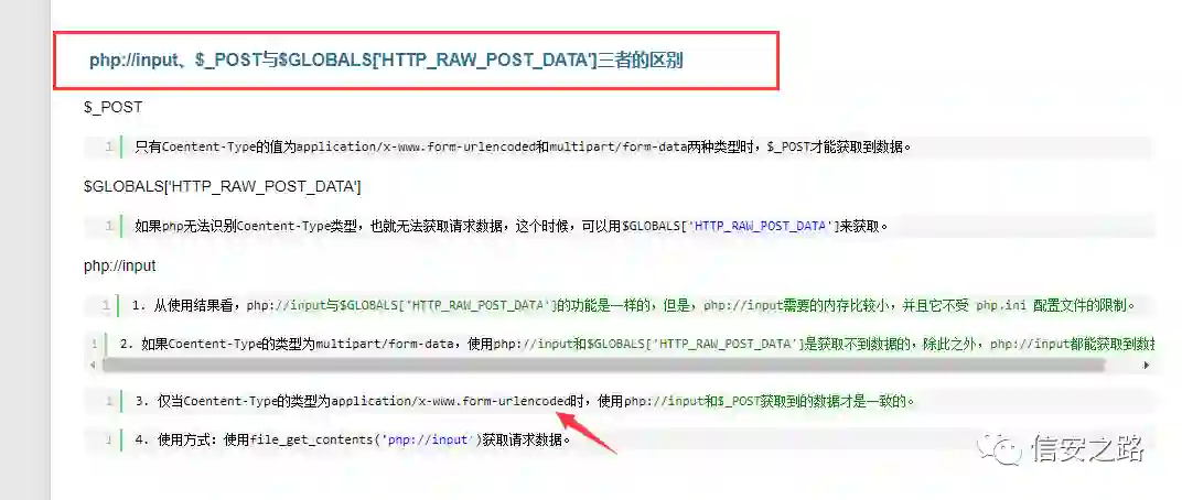 咋一看 $GLOBALS['HTTP_RAW_POST_DATA'] 一个全局变量,以为是固定值。但是不甘心没找到新的 XXE 漏洞点,于是抱着试试的心态去百度了一下这个变量。看到如下图的信息,我就高兴了起来。也就是说这个变量传参的效果和伪协议传参的效果是一样的。