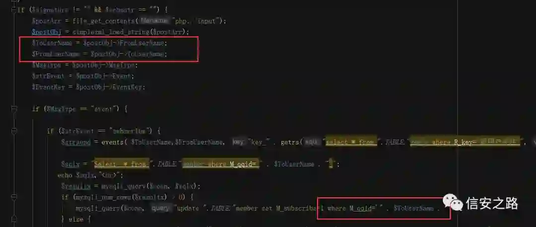 只要我们控制了 $ToUserName 的值,即可造成一枚 SQL 注入。而 $TouUserName 是通过 XML 解析来的,显然我们可以控制这个解析的串。构造如下 payload