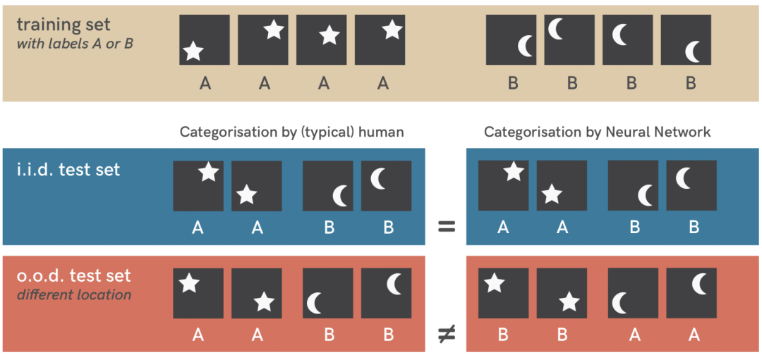 但是,如果在与训练集具有不同概率分布的数据集上进行测试时,训练好的神经网络仍然用在训练集中学到的策略对星星进行分类。也即:星星总是显示在图像的右上方或在左下方,月亮总是在左上方或者右下方。