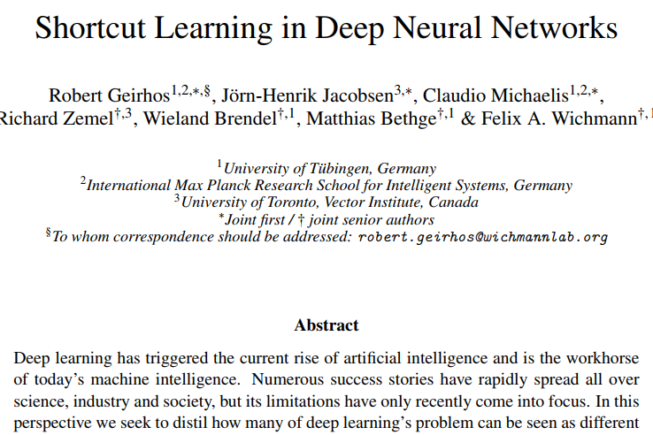捷径学习无论是对于生物,还是对于人工神经网络来说,似乎都是学习系统中普遍存在的一个特征。许多深度学习的问题都是通过捷径学习联系在一起的,例如模型利用数据集的捷径机会,有可能只选择几个预测特征,而没有仔细考虑所有可用的证据,从而导致意外的泛化失败。但是受影响区域之间的“连接点”可能会促进成功,这些成功可以在不同的应用领域产生非常有价值的影响。