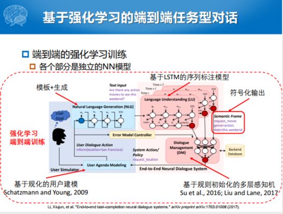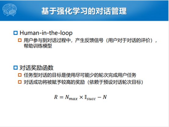 我们说基于强化学习的对话管理,通常来说有两个比较重要的过程。一个是我们怎么样让用户能够参与到整个系统的构建的过程中,现在比较火的就是叫Human-in-the-loop。当然这种方式有一种不好,就是确实耗时耗力,那我们不用它的话,初始系统化又不是太好。所以现在比较大的方向就是要有一定人的参与,但是又不能太耗费人力。另外就是怎么样定义对话奖励函数,两个方面,尽可能提高完成的任务成功率和尽可能的减少平均对话的函数。