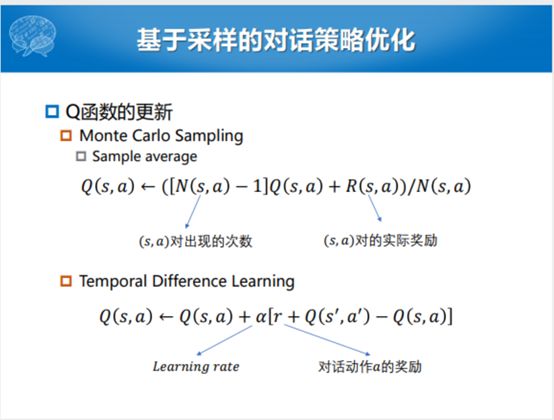 这里面还有一个问题,就是动态规划的方式,尽管可以通过策略缩小状态空间,缓解对话状态和动作空间巨大的事情。但是基本假设其实还是扫描整个的空间,可以通过剪枝,可以通过什么样的规则预先制定对话状态和动作之间的冲突方式,缩小这个状态空间。不管缩到多小,这种方法的特点就是要扫描整个状态空间。那能不能通过采样的方式部分的估计,通过部分的样本估计整个样本的分布。训练深度学习也会使用采样的方式,包括以前做LDA也是采样的方式估计的。
