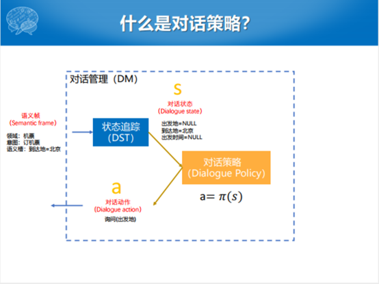 文本输入的句子,通过语义槽的填充之后,就识别出这样一个结果。输入的语言理解的状态,经过中间的对话管理的处理之后,得出来一个对话的动作(action)。比如,我们得出来一个动作是询问出发地,这个询问出发地的对话动作就会输入给自然语言生成的模块,自然语言生成模块就根据这个动作产生一个自然语言文本的回复“请问您从哪里出发”。