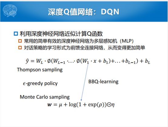 更优化的Q值函数,这个深度Q值网络,最深的时候就是AlphaGo的时候,这个Q函数之前的方式可以用值迭代的方式更新。但是有一个问题,我们怎么样来估计下一个状态S和给定这个A,下一个动作A1的奖励值。传统的方法可以用Bernoulli方程的方式去求解,但是时间复杂度特别高。深度神经网络出来之后,就想反正输入是一个状态和动作,你就要估计一个Q值,我用一个MLP行不行,就把这个对话策略学习形式变化一个前馈全连接网络,从而变得更加简单,不管什么参数都蕴含在W矩阵里面。当然这个训练过程中还是采样的方式,采用采样的方式,去更新那个π函数,我们说用Monte Carlo的方式来更新所有W的参数,这种方式也是后面提到的微软2018年发表的BBQ-learning的方式。