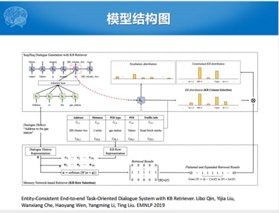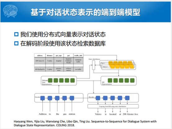 为了想做到完全的端到端,Eric和Manning提出了一个完整的端到端模型和相关的数据集。这种模型不把语义槽东西显式建模,把任务型拆成若干个单轮对话。问你一个问题回答一个槽,把整个过程当中一个一个离散化,变成了用Seq2Seq的模型一步一步的生成。生成过程之中会用注意力的机制,在解码过程中会选当前的输出。因为有一个数据库,这个数据可以认为是所有的任务型对话的数据,无论是状态还是取值的可能性,都包含在数据表达里面。解码的时候就想,解码这句话的时候究竟是从用户输入的词里面拷贝,还是在给定的候选的数据库里面揪一个词出来的过程。整个过程就变成了一个Seq2Seq的过程,生成的话还是像任务型的这种方式。