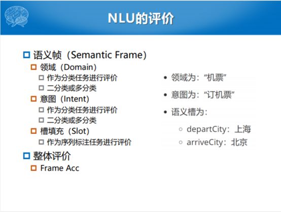 任务型对话系统这么多模块,怎么去评价是另一方面。第一方面就是评价什么,这个任务型对话系统中哪些需要评价,其实每一个过程都需要评价。这里面就涉及到整体和部分之间评价的关系,整体上面其实我们也之前也说到了,整个任务型对话系统优化两个大的方向,一个是对话成功率,一个是平均对话轮数。其实整个过程之中,既然有这样优化的目标,相对来说就有一个这样的客观评价的指标。