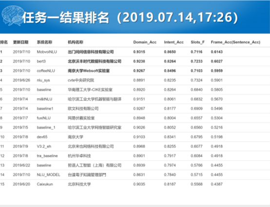 我们今年换了两个任务,提升了任务的难度,任务1不再是领域分类,而是要做领域、意图、语义槽的识别。这个特别难,跟我们以前说的任务1来说任务增加了很多的难度,我们评测的指标也比较严苛,要让这些全做对才叫对。最终我们看一下指标,出门问问在Domain上面刷了到了0.9分,全体的ACC能达到0.61,这个是整个参赛队伍整体的排名。