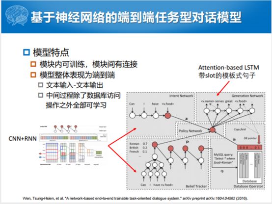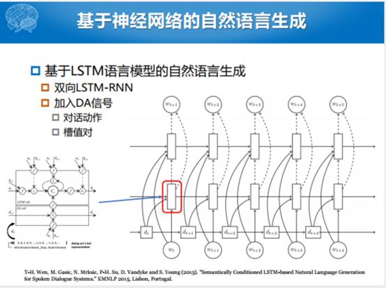 这个是双向的RNN,但是这个里面的每一个unit替换成了LSTM,加入了Domain Act,就是对话动作的信息。除了对话动作的信息,还加入了槽值对的信息,整个过程还是用双向的LSTM生成句子。把DA信号加进去主要加的是这部分。这个就是自然语言生成这部分,这部分没有特别多的工作,大家可能大部分的工作集中在NLU和DM方面。