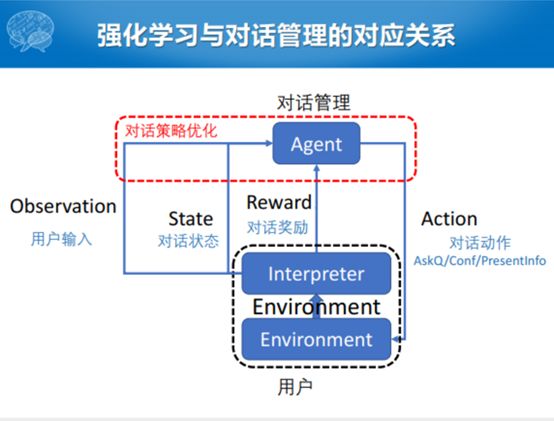 动作之后,还有就是用户会针对对话管理系统给出的动作进行一部分反馈,有的人把这块表示成大的就叫环境(Environment),也有的人把这块表示成Interpreter和一个Environment,这里面表示这两种形式都可以。但是这里面其实不光是Environment,还要对对话产生的动作进行一个表示,表示之后产生一个对话的奖励,回馈给对话系统。整个过程之中,除了Interpreter的奖励之外,还会产生对用户输入的识别以及对话状态的建模。Agent这边对话管理的动作实际是到Environment这块,出口是从Interpreter出去的。