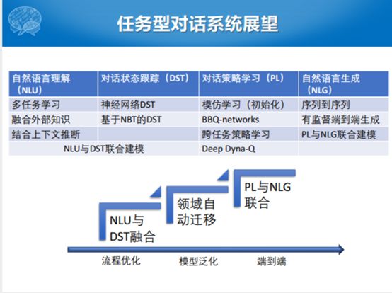 最后对我们今天讲的任务型对话做一个总结和展望可能的趋势。我们今天从自然语言理解讲到对话管理和对话状态追踪,也说到了多领域和多语言的趋势,这个也是特别重要的。我从对话策略开始讲,从规则到规划到概率再到神经网络的方式。我们也给了自然语言生成和端到端的进展,紧接着讲了评价的方式。最后我们给出一些展望,自然语言理解有多任务学习的方式,融合外部知识,知识的引入,另外还有就是结合上下文自然语言理解的推断。对话状态跟踪这一块都是神经网络的方式,但是除了单独的技术发展趋势之外,NLU和DST联合建模的时候也有。对话策略学习这块, BBQ-learning怎么采样,怎么更新的,用什么样的方式去做这个事情。除了本领域以外,一个Domain之内可以进行一个跨领域、跨任务的学习,包括策略学习和端到端自然语言的生成的结合。整个的发展趋势,从流程优化到模型泛化再到端到端是一个大的趋势,但是端到端不是那么自然的。先是NLU与DST的结合,然后是PL与NLG的联合。