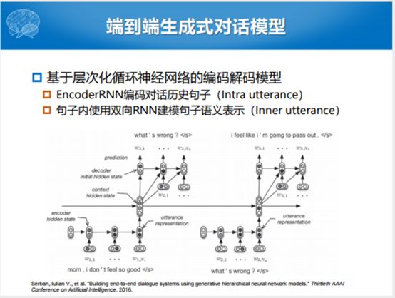 实际的状态就是端到端的生成式对话模型,最开始可以看到的不是任务型的对话,是开放域的对话,是2016年蒙特利尔大学他们提出的模型叫做HRED的模型,这样一句话建模的时候,你可以从第一个词建模到最后一个词。如果你说给你一个对话历史,建模多轮的情况下,建模整个的对话历史,建立多轮的形式下,给我一个合理的回复,怎么样建立对话历史。他们就提出一个简单粗暴的方式,句子和句子之间也用RNN去Encoder。