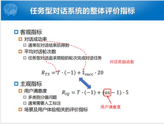 这个就是我们对话奖励优化的目标和方向,这两个就是一个客观的指标。我们也说了更优的奖励函数是考虑到主观指标就是人的用户满意度,把用户满意度离散化,离散成若干值,这个用户满意度就是刚才所列的交互的质量,就是IQ的值。我们说用户满意度可以是一个连续值,也可以是一个离散的值,我们如果把它弄成离散的1-5的值,跟客观的指标有对应的关系,能够建立不同的用户满意度的不同的奖励函数。