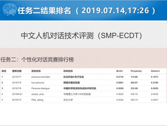 任务二是闲聊的项目,我们前两届都没有引入闲聊的项目。这届我们想能不能引入一个开放域对话的任务,这里面引入了一个个性化对话生成的任务。这个任务就是我们给定一个人与人之间对话的数据片断,给出两个用户,这两个人若干属性的属性值。你拿这个做一个训练数据,测试的时候给你一个属性的值的时候,你要能够生成和属性值不矛盾或者一致的对话。这就是考验对话系统,通过显式的对话的个性信息来建模生成符合属性信息对话的能力。这个也比较难,从头到尾大系统都比较难,最后成功提交有5家。