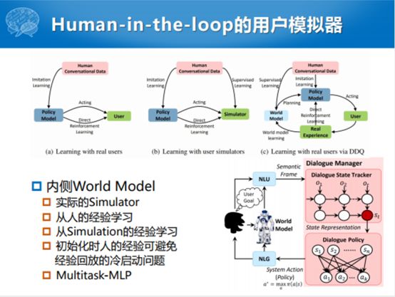 更加真实的一个用户模拟器方面,也是微软提出来这样一个模型。原来要么是机器人,要么是人跟NLU,要么就是这个机器人,就叫对话模拟器,根据dialogue corpus去学,学完了之后不断地去训练dialogue model,人参与度不高。在整个框架下,分成左右两部分,第一部分是人教Simulator,整个过程中,投入很小的精力初始化,初始化之后就跟这边去学。人看到有一些状态和动作之间的转移方式不对,再去纠正它,再去训练它。通过这种分时分阶段的对话的模拟,能够训练更好的,就是Simulator和这个人越来越像。
