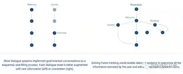 Frame 这个数据集之所以叫这个名字,主要是其论文中[4]提出了一种新任务,叫 Frame Tracking。区别于传统任务导向型对话中的 Dialogue State Tracking(DST)是以每个对话轮(turn)为粒度,Frame 相当于将对话切割成了更大更粗粒度的一个个小目标。以一个例子来说明,比如我们在定制一次旅行计划的时候,往往会很向对比很多个目标(酒店、机票、城市组合等),这些横向对比的小目标可能是在几个对话轮中都提到的,又可能在对话进行到后面的时候重新被提起(比如做横向比较的时候),那么这些时候就会涉及到 frame refering 的问题。