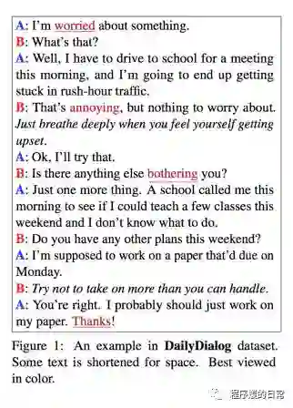 为了挖掘更好的能服务于日常沟通的对话模型,作者通过爬取英语口语对话网站构造了 DailyDialog 这个数据集。因为是日常生活中的对话,所以对话涵盖了很多情感信息,也有很多比较自然的对话模式。可以看一个作者给出的例子: