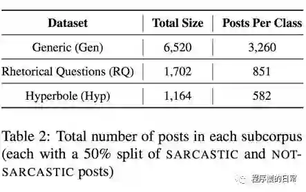 在这份语料中,作者给出了主要四种数据:一般形式的讽刺语(general)、比喻型的讽刺(rhetorical questions)、夸张型的讽刺(hyperbole),和非讽刺语(负样本)。
