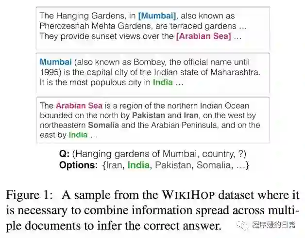 第一个要分享的是一篇多轮/级推理阅读理解数据集的论文(Multi-hop Reading Comprehension)[1]。这个项目名叫 QAngaroo,并且在论文中通过同样的方法构造了两个多轮推理阅读理解数据集,一个叫 WikiHop 一个叫 MedHop。