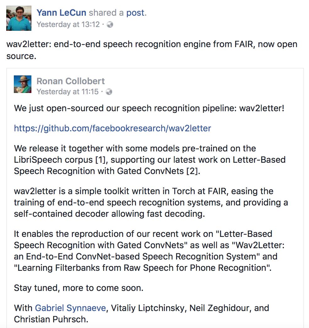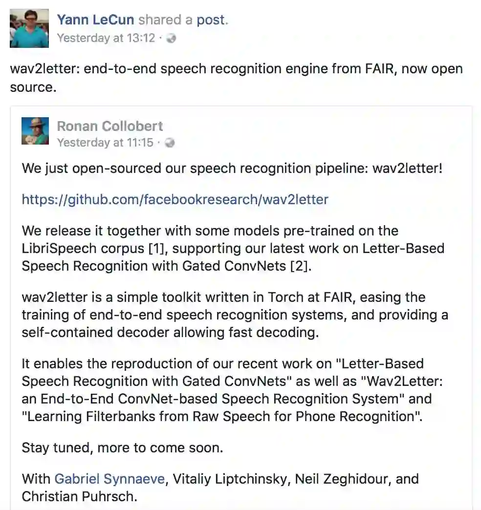 Facebook也发布了公开信介绍这一开源项目,包括该项目主要负责人Ronan Collobert、Facebook AI研究中心负责人Yann Lecan等在内的研究者都在推特上介绍了这一发布。