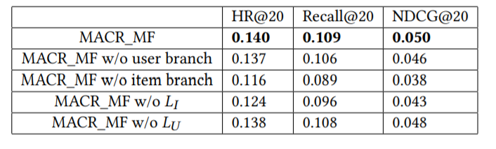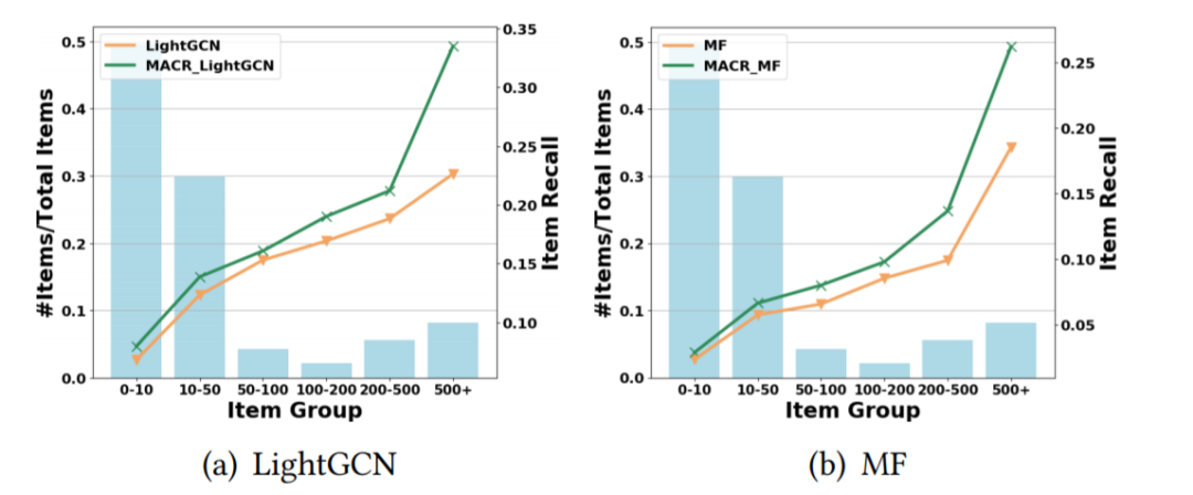 【推荐结果分析】文章将物品根据在训练集中的流行度划分成不同的分组图,并计算这些物品在测试时的平均推荐准确度,从图7中可以发现对于不同分组,因果去偏的方法均取得较大提升,并且流行度越高,提升越大,说明了因果去偏的有效性。
