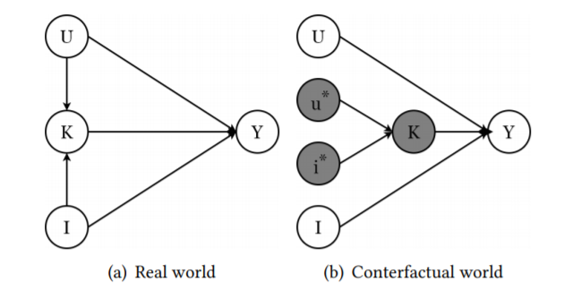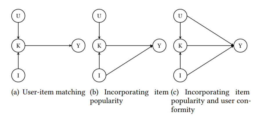大多数的推荐系统模型之所以受到流行偏见的影响,是因为这些模型建模了用户和物品之间的交互,而这些交互是从训练数据估计出的,从而会导致模型不可避免地偏向流行物品。从因果关系的角度来看,物品的流行程度直接影响推荐得分,因此消除了从物品流行程度到推荐得分的直接影响就可以消除流行度偏差,为此首先需要在训练时建模因果图中的因果效应。