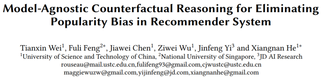 题目:Model-Agnostic Counterfactual Reasoning for Eliminating Popularity Bias in Recommender System