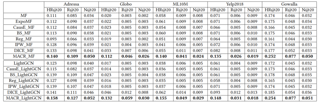 【整体效果】表1展示了五个公开数据集的数据统计情况,图1展示了这些数据集下因果去偏算法和当前最先进的算法的对比,可以看出在无偏的用户物品交互场景中,因果去偏算法的性能显著优于最先进的基线,在两个经典基准模型(