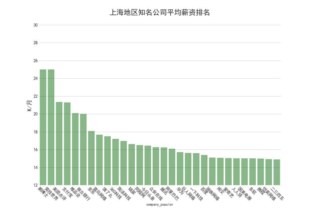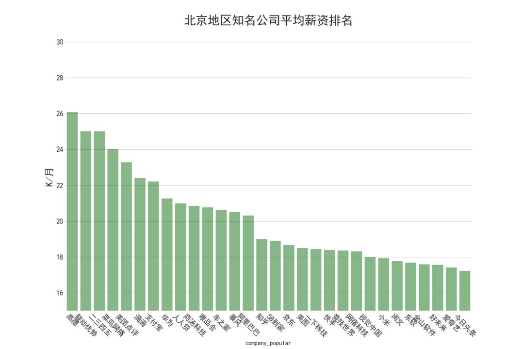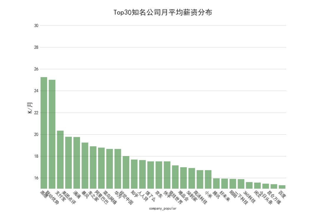人均薪资水平排名前三十的公司如下:高德公司的技术类高端职位,如算法、技术专家等职位需求尚未满足;数据类职位的月均薪资,低于高德公司的月平均薪资,降低到了 26K ,但依然位居首位。