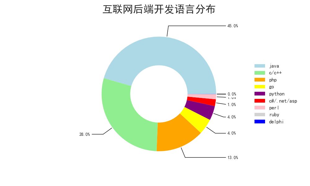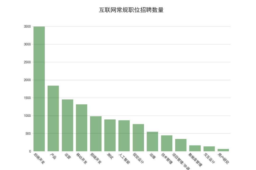 常规互联网职位分布如下图,其中后端开发、产品和运营职位数量排名前三,排名未变。