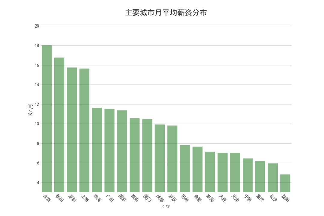 6 月份,主要城市的平均薪资分布如下:北京地区 6 月平均薪资为 18K ,深圳 6 月的平均薪资,从上月的 18K 下降到 15.7K 。