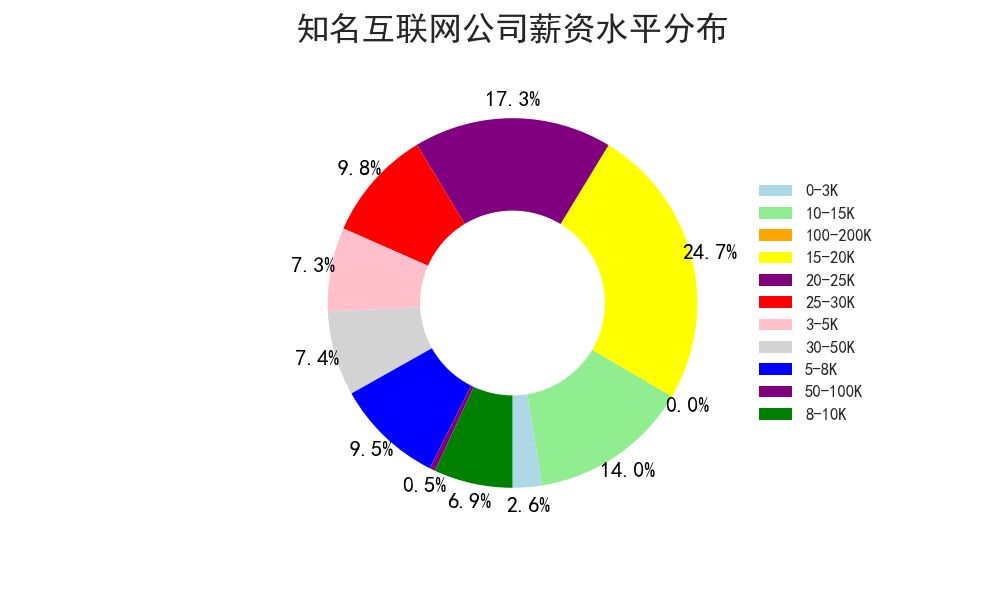 6 月份,互联网平均薪资水平分布如上图所示,较 5 月份没有明显变化。其中,10k-30K 薪资水平的职位占总体比例的 65.8%,比上个月上升 了 0.6 个百分点。