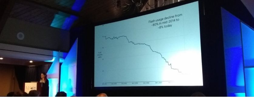 据外媒消息,谷歌工程总监 Parisa Tabriz 上周在圣地亚哥召开的网络与分布式系统安全研讨会(NDSS)上发表主题演讲时,分享了关于 Flash 使用数量的统计数据。她表示,Chrome 用户在浏览时加载 Flash 的比例从 2014 年的 80% ,下降到了 2018 年初的 8%以下。