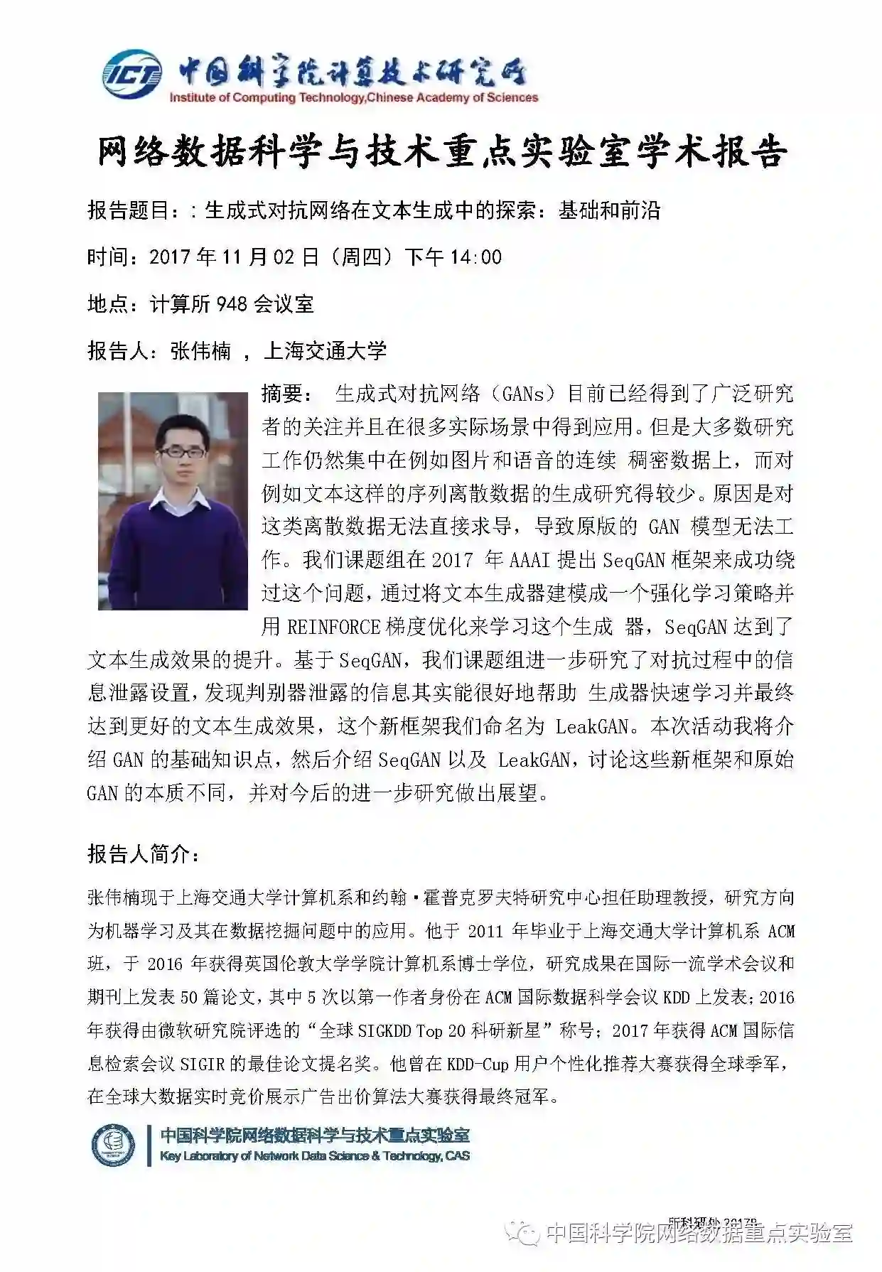 摘要: 生成式对抗网络(GANs)目前已经得到了广泛研究者的关注并且在很多实际场景中得到应用。但是大多数研究工作仍然集中在例如图片和语音的连续稠密数据上,而对例如文本这样的序列离散数据的生成研究得较少。原因是对这类离散数据无法直接求导,导致原版的GAN模型无法工作。我们课题组在2017 年AAAI提出SeqGAN框架来成功绕过这个问题,通过将文本生成器建模成一个强化学习策略并用REINFORCE梯度优化来学习这个生成器,SeqGAN达到了文本生成效果的提升。基于SeqGAN,我们课题组进一步研究了对抗过程中的信息泄露设置,发现判别器泄露的信息其实能很好地帮助 生成器快速学习并最终达到更好的文本生成效果,这个新框架我们命名为LeakGAN。本次活动我将介绍GAN的基础知识点,然后介绍SeqGAN以及LeakGAN,讨论这些新框架和原始GAN的本质不同,并对今后的进一步研究做出展望。